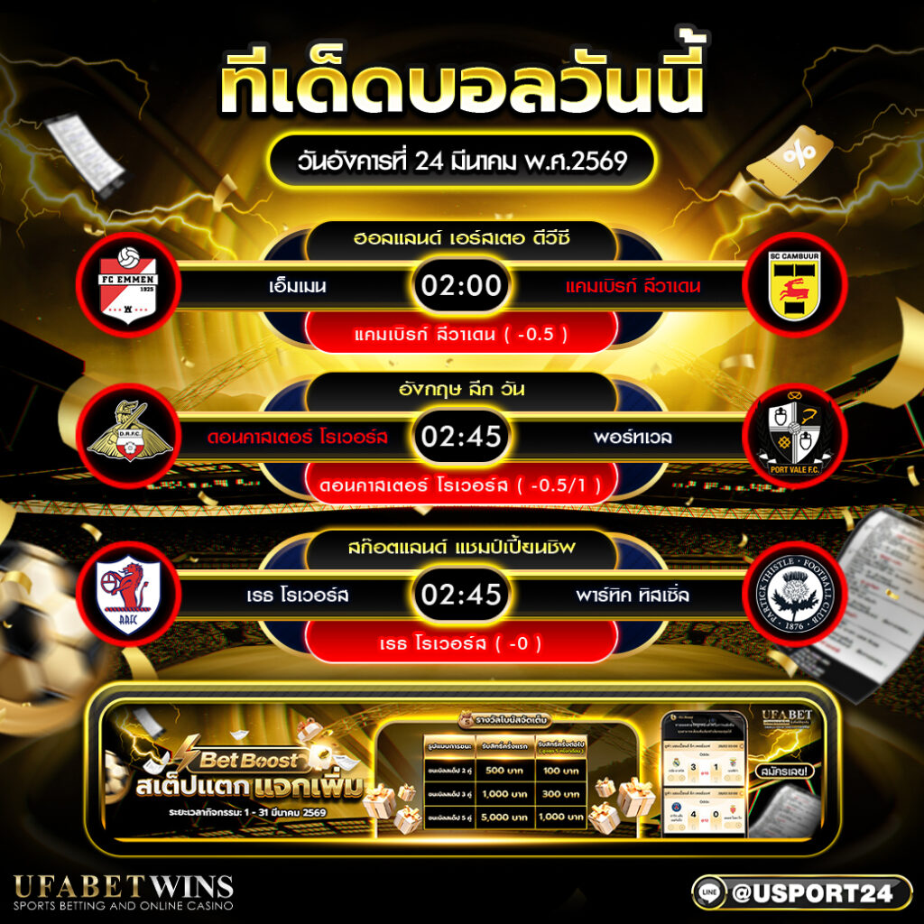 วิเคราะห์บอลวันนี้ 24 มี.ค. 2569 เป็นอีกหนึ่งชุดคอนเทนต์ที่เหมาะสำหรับแฟนบอลซึ่งต้องการเช็กทรรศนะก่อนเกมแบบครบถ้วนในหน้าเดียว เพราะคืนวันอังคารนี้มีคู่ที่น่าสนใจจากหลายรายการ ทั้งฮอลแลนด์ เอร์สเตอ ดีวีซี, อังกฤษ ลีก วัน และสกอตแลนด์ แชมป์เปี้ยนชิพ โดยแต่ละคู่มีราคาเปิดและแนวทางการเลือกเชียร์ที่ชัดเจน ทำให้ผู้อ่านสามารถใช้ข้อมูลประกอบการติดตามเกมได้ง่ายขึ้น