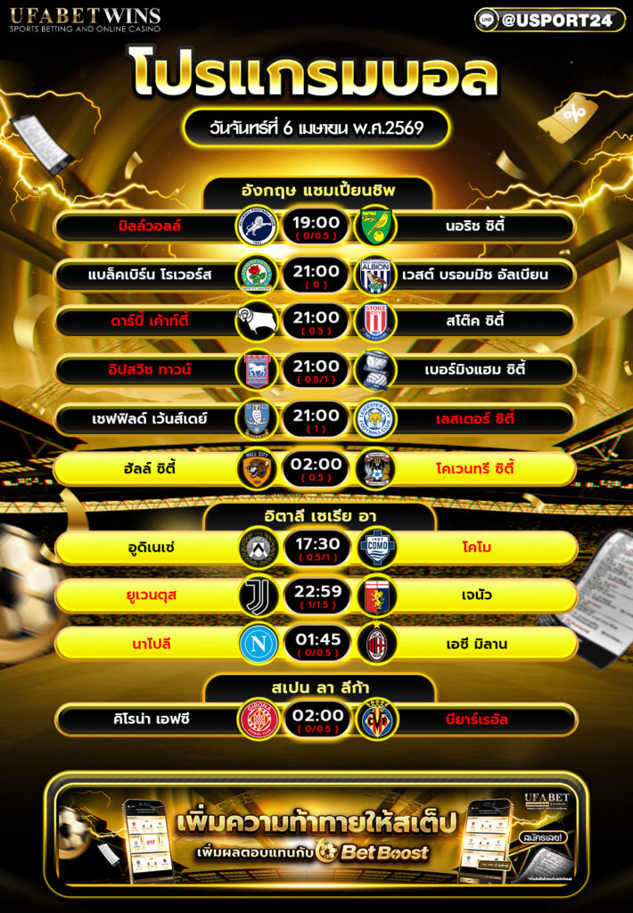สำหรับคนที่ต้องการดูภาพรวมของ โปรแกรมบอล วันนี้ 6 เม.ย. 2569 แบบครบในหน้าเดียว วันนี้มีคู่แข่งขันที่น่าสนใจหลายคู่ โดยเฉพาะฝั่งเซเรีย อาที่มีเกมของ ยูเวนตุส พบ เจนัว และ นาโปลี พบ เอซี มิลาน ซึ่งเป็นคู่ที่ได้รับความสนใจจากแฟนบอลจำนวนมาก ขณะที่ฝั่งแชมเปี้ยนชิพก็มีโปรแกรมแน่นตลอดคืน ทั้ง มิลล์วอลล์ พบ นอริช ซิตี้, แบล็คเบิร์น โรเวอร์ส พบ เวสต์ บรอมมิช อัลเบียน, ดาร์บี้ เค้าท์ตี้ พบ สโต๊ค ซิตี้ และ เชฟฟิลด์ เว้นส์เดย์ พบ เลสเตอร์ ซิตี้ ส่วนลา ลีก้าก็มีเกมระหว่าง คิโรน่า เอฟซี พบ บียาร์เรอัล ให้ติดตามในช่วงดึกเช่นกัน