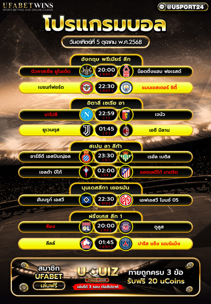 โปรแกรมฟุตบอล ประจำวันที่ 5 ตุลาคม 2568