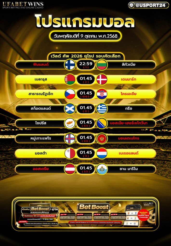 โปรแกรมฟุตบอล วันที่ 9 ตุลาคม 2568 | เวิลด์คัพ 2026 ยุโรปรอบคัดเลือก