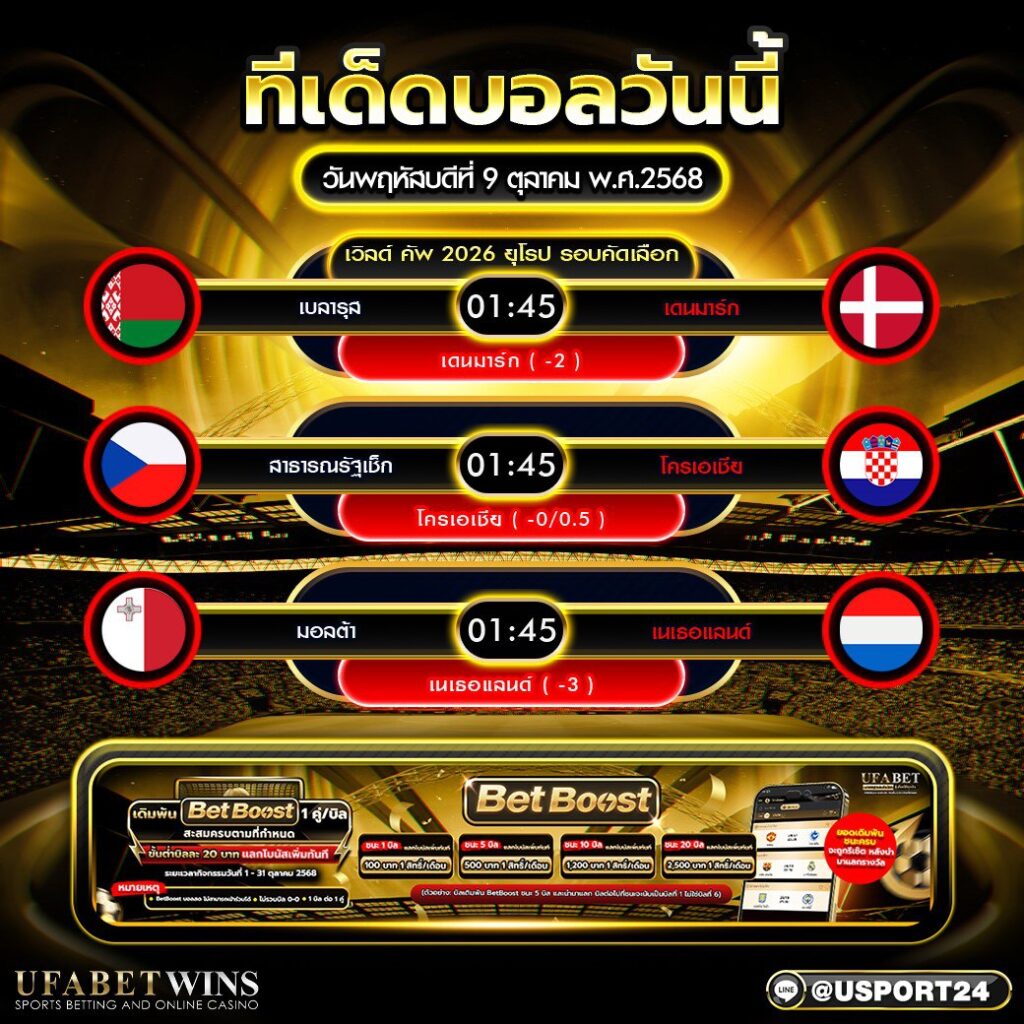 ในภาพรวม โปรแกรม วิเคราะห์บอล วันที่ 9 ตุลาคม 2568 ของรอบคัดเลือกฟุตบอลโลกโซนยุโรปคืนนี้ถือว่าน่าสนใจทุกคู่ ทีมใหญ่หลายทีมต้องเน้นสามแต้มเพื่อต่อยอดสู่รอบต่อไป โดยเฉพาะเนเธอแลนด์ เดนมาร์ก และออสเตรีย ที่มีโอกาสสูงในการเก็บชัย ส่วนคู่ที่มีความสูสีอย่าง สาธารณรัฐเช็ก พบ โครเอเชีย และ สก็อตแลนด์ พบ กรีซ ก็เป็นแมตช์ที่นักวิเคราะห์และแฟนบอลต้องจับตามอง เพราะมีผลต่ออันดับในกลุ่มโดยตรง