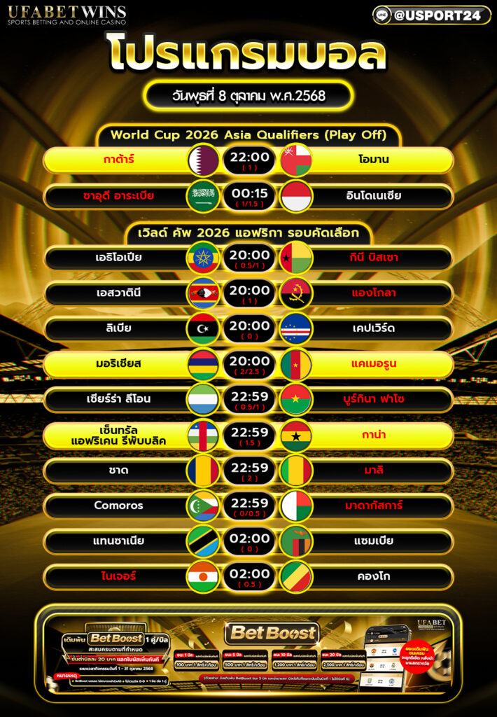โปรแกรมฟุตบอล วันที่ 8 ตุลาคม 2568 ถือเป็นอีกหนึ่งวันที่แฟนบอลทั่วโลกต่างเฝ้ารอ เพราะเป็นวันสำคัญของการแข่งขันฟุตบอลโลก 2026 รอบคัดเลือก ทั้งในโซนเอเชียและโซนแอฟริกา โดยในวันนี้มีหลายคู่ที่มีผลต่อการเข้ารอบหรือการตกรอบโดยตรง ไม่ว่าจะเป็นทีมชั้นนำอย่างกาต้าร์ ซาอุดีอาระเบีย กาน่า หรือแคเมอรูน ต่างเตรียมพร้อมลงสนามอย่างเต็มกำลังเพื่อเก็บแต้มสำคัญในเส้นทางสู่ฟุตบอลโลก การแข่งขันทั้งหมดในโปรแกรมฟุตบอลคืนนี้จึงน่าติดตามอย่างยิ่ง ทั้งในด้านแท็กติก ฟอร์มการเล่น และความดราม่าที่อาจเกิดขึ้นได้ทุกเมื่อ
