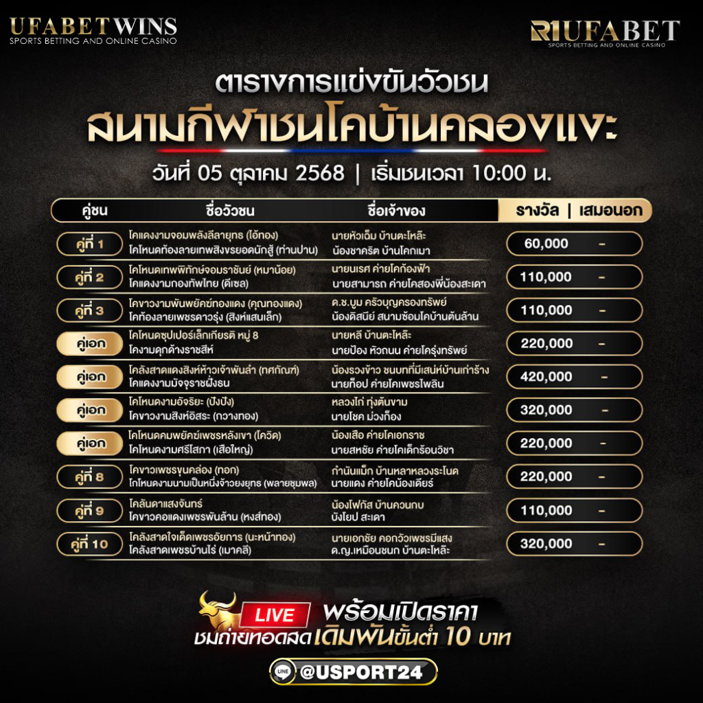 โปรแกรมวัวชน วันที่ 5 ตุลาคม 2568 | สนามกีฬาชนโคบ้านคลองแงะ