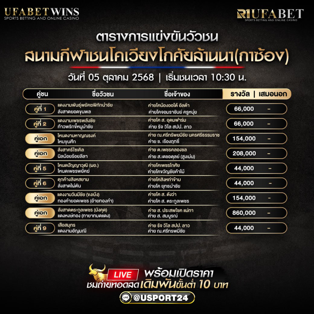 โปรแกรมวัวชน วันที่ 5 ตุลาคม 2568 | สนามกีฬาชนโคเวียงโกศัยล้านนา (กาช้อง)