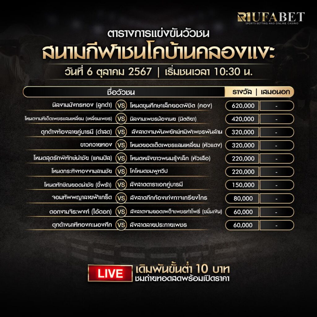 โปรแกรมวัวชน วันที่ 6 ตุลาคม 2568 | สนามกีฬาชนโคบ้านคลองแงะ