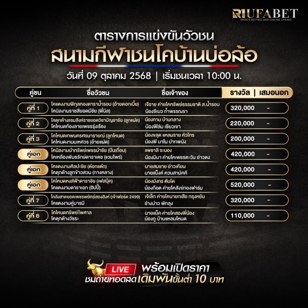 วิเคราะห์บอล โปรแกรมวัวชน วันที่ 09 ตุลาคม 2568 สนามกีฬาชนโคบ้านบ่อล้อ
